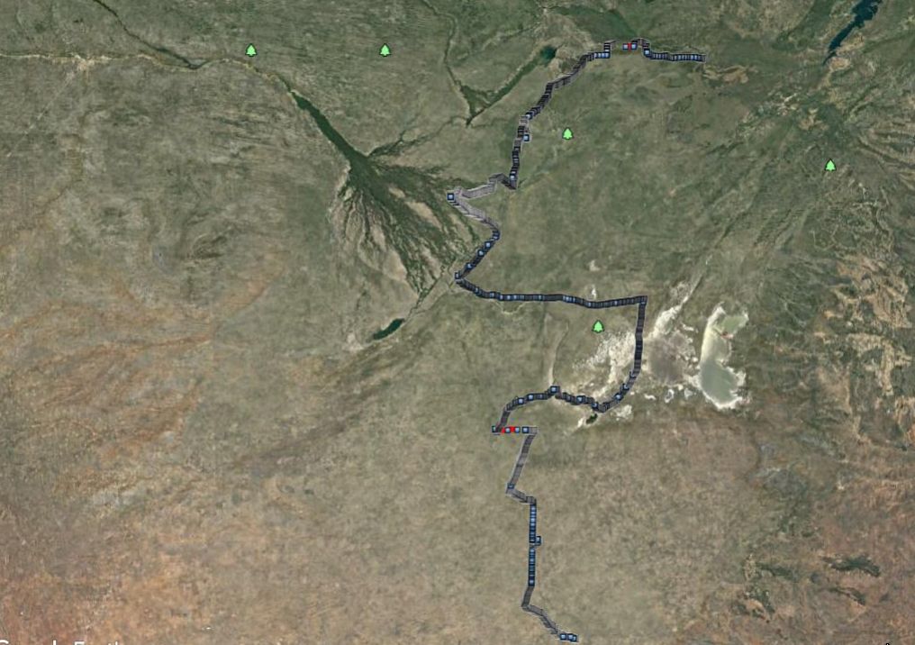 Immagine satellitare da Google Earth con sovrapposizione del nostro percorso. Ben visibile il delta dell’Okavango