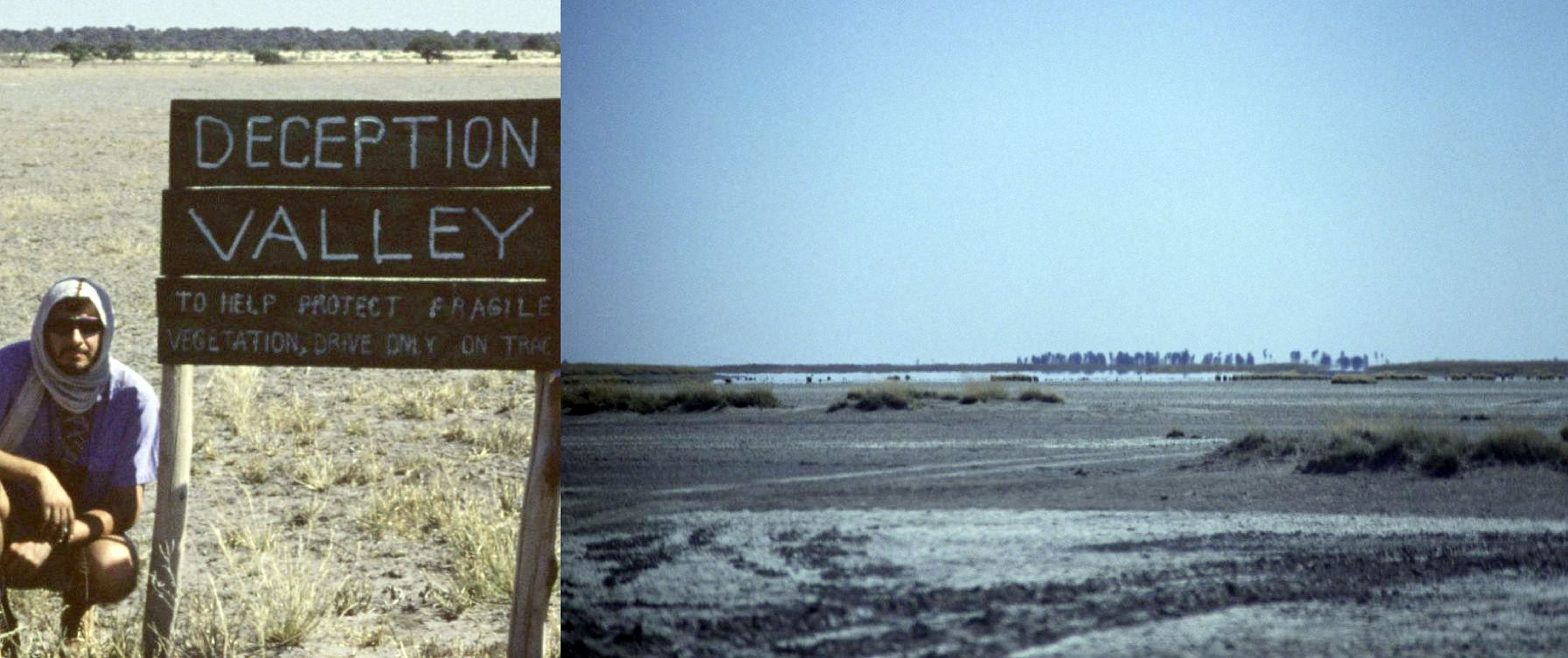 Sembra facile orientarsi con la bussola ed un navigatore satellitare portatile (sia pur primitivo): quando navighi senza tracce evidenti basta uno scostamento di due-tre gradi per trovarti, dopo qualche chilometro, lontani centinaia di metri dalla pista (ammettendo che essa prosegua perfettamente lineare). Per fortuna siamo riusciti a ritrovare sempre le labili tracce e siamo giunti alla Deception Valley (Valle del miraggio).