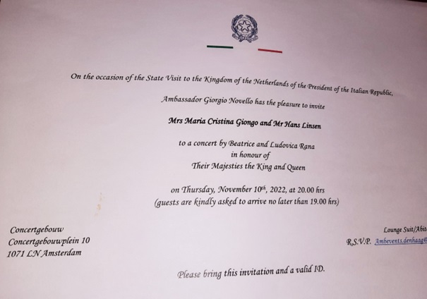 Ci sono stati vari commenti di dissenso nei confronti di questo atteggiamento “altezzoso” dei monarchi. Protocollo o non protocollo… tutti si aspettavano almeno un saluto agli ospiti da parte del re, per gli italiani nella sala. Oltre ad un ringraziamento a chi aveva dedicato loro questo concerto; il nostro presidente ed il nostro Ambasciatore, appunto! Tra l’altro l’Ambasciatore Novello, era appena uscito da un periodo di malattia dovuto al Covid che lo aveva “brutalmente” colpito. Nonostante ciò ancora una volta c’era! Sempre accanto a Mattarella, in questa faticosissima “maratona olandese.”