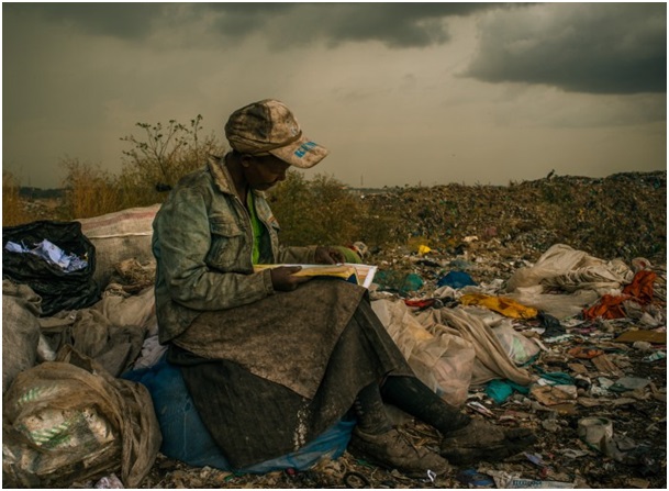 Una donna si riposa nella discarica in cui lavora, raccogliendo materiale da riciclare per mantenersi. La discarica è vasta più di 1.400 ettari, e circondata da baraccopoli in cui vive circa un milione di persone. La donna ha spiegato di desiderare più tempo per sfogliare i libri che trova di tanto in tanto: «Così ho qualcos’altro da fare durante il giorno oltre a raccogliere spazzatura».