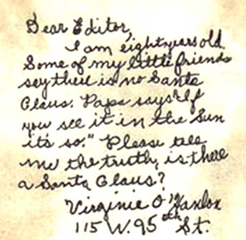 Insomma tant’è. La bimba Virginia prende carta e penna e scrive: «Caro direttore, ho otto anni. Alcuni dei miei piccoli amici dicono che Babbo Natale non esiste. Mio papà mi ha detto: “Se lo vedi scritto sul Sun, sarà vero”. La prego di dirmi la verità: esiste Babbo Natale? Virginia O’Hanlon»