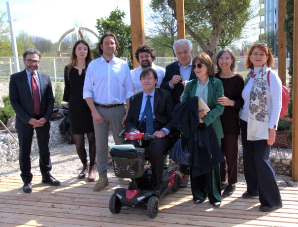 Floriade, Almere (Olanda), nel giardino del padiglione italiano con il nostro Ambasciatore Giorgio Novello e coloro che hanno contribuito alla creazione e costruzione del padiglione. Nella foto anche sua moglie Biancamaria De Vivo, con una mano sulla mia spalla, straordinaria compagna di vita; accanto a lei la direttrice dell’Istituto italiano di cultura di Amsterdam, Paola Cordone (a destra, con lo zainetto rosso). Sul lato sinistro Luigi Ferrelli, Direttore dell’Ufficio ICE per i Paesi Bassi e Vice Commissario Generale dell’Italia a Floriade. Foto Hans Linsen.