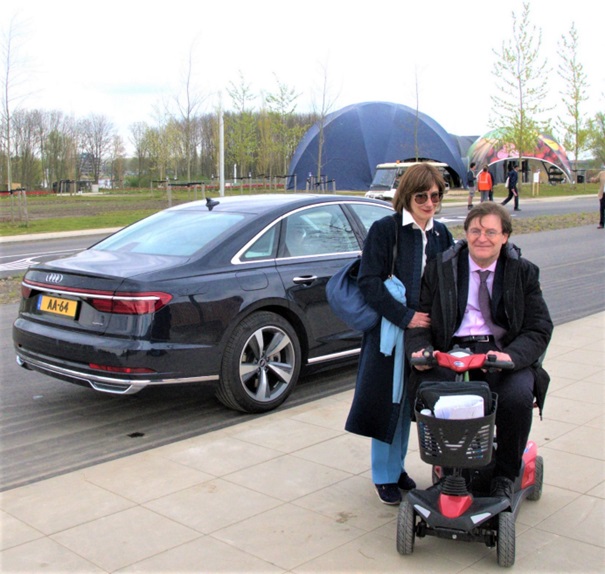 Floriade, Almere, 13 aprile 2022. Ancora una bella immagine del nostro Ambasciatore Novello, con la giornalista Maria Cristina Giongo, fotografati da Hans Linsen. Da notare la specialissima…automobile alle spalle!